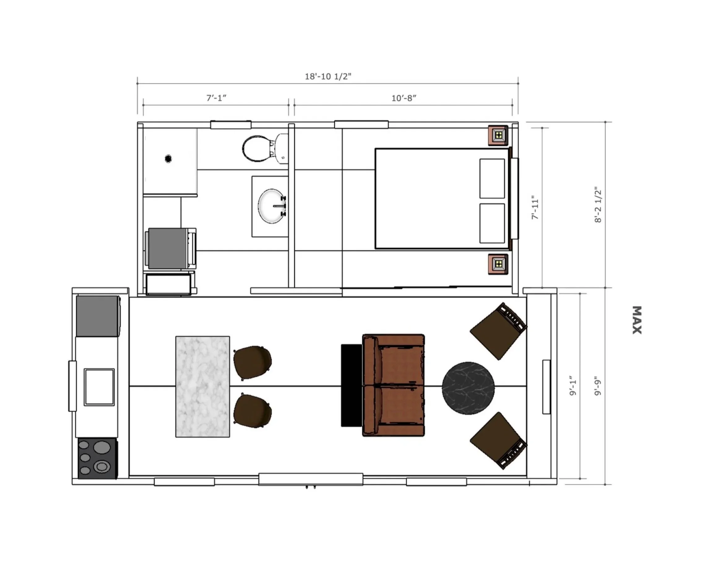 Central Coast Tiny Homes offers single level floor plans from 300 to 400 square feet. Our Max models are among the largest luxury homes on the market. Created to provide spacious one and two bedroom floor plans with high ceilings and no lofts.
